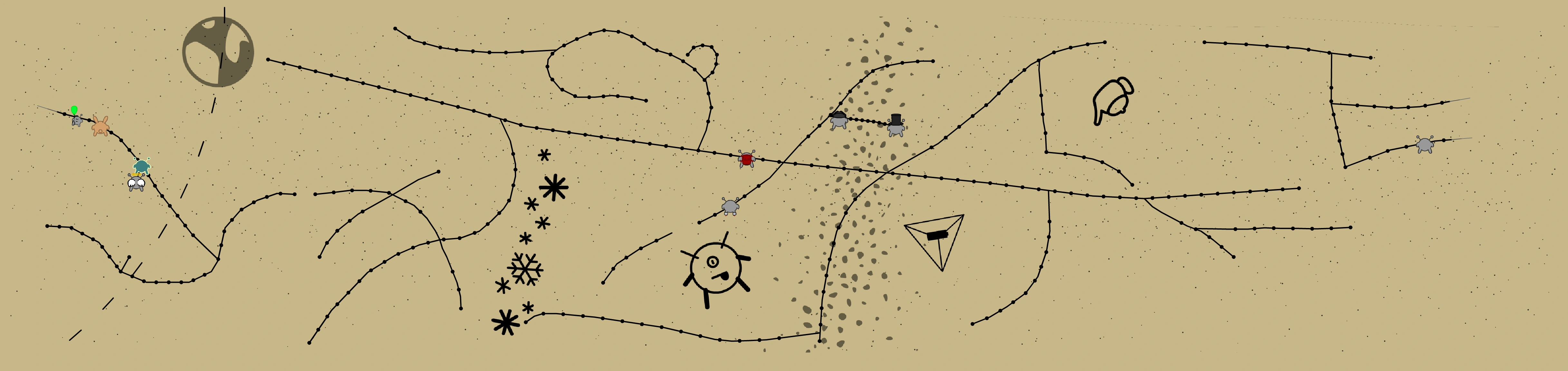 This Galaxy Map appears as a map in the game, and it is almost blank at first, with only small dots representing, stars and a large planet. As you continue in the game, more and more levels will be shown as dark dots connected with a black line.
